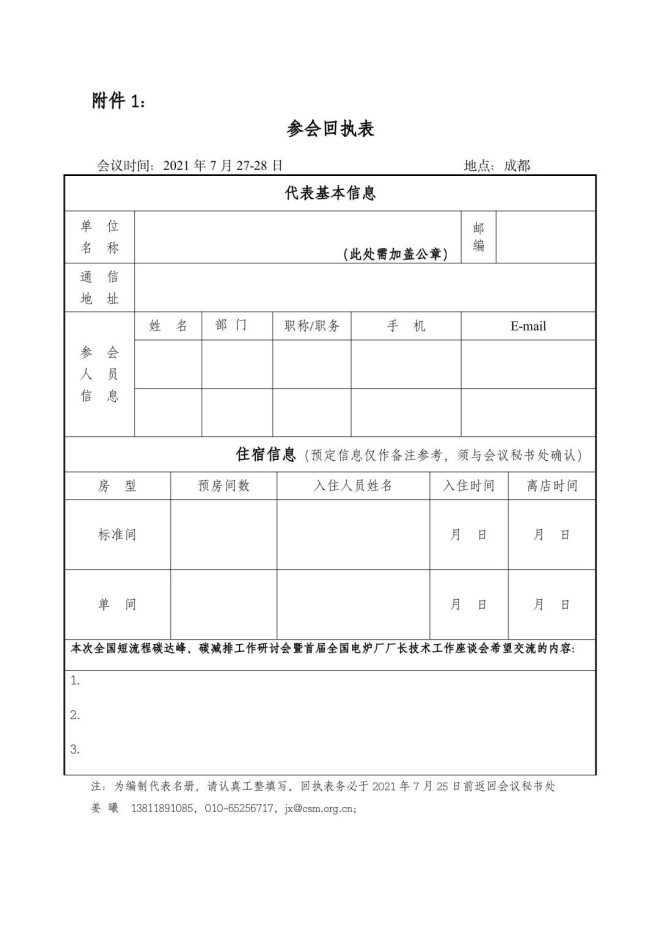 擬參會的單位,回執必須加蓋公章,必須提交交換資料,並於7月25日前返回交換資料至中國金屬學會接收材料聯係人:薑 曦 13811891085 ; 交換材料提綱見附件2. 中國金屬學會“全國短流程碳達峰、碳減排工作研討會”暨首屆全國電爐廠長技術工作座談會交換材料提綱。