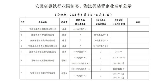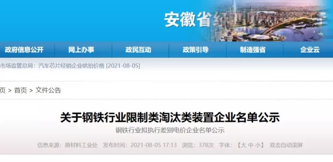 8月5日,安徽省經濟和信息化廳網站發布公告稱,根據《國家發展改革委 工業和信息化部關於運用價格手段促進鋼鐵行業供給側結構性改革有關事項的通知》(發改價格〔2016〕2803號)要求,將《安徽省鋼鐵行業限製類、淘汰類裝置企業名單》公示,名單中的17家鋼企擬被執行差別電價。公示期為8月5日—8月11日。