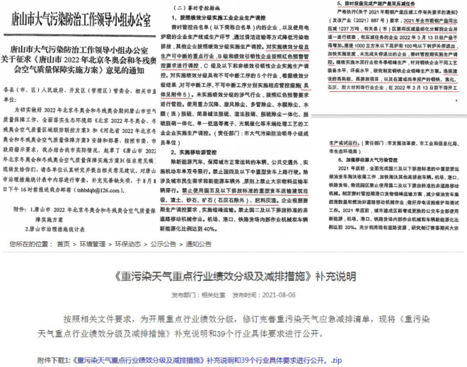 8月6日,唐山市印發《唐山市2022年北京冬奧會和冬殘奧會空氣質量保障實施方案》征求意見稿;唐山市環保局發布了《重汙染天氣重點行業績效分級及減排措施》補充說明。