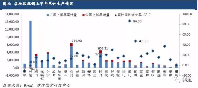 圖3數據顯示,今年上半年粗鋼日均產量普遍高於去年同期值,日均產量最高達324.18萬噸較去年最高306.46萬噸增加17.72萬噸。