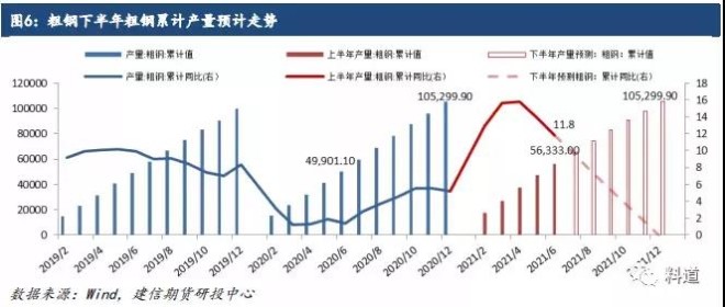 2020年我國粗鋼累計產量共計105299.9萬噸,2021年1-6月我國粗鋼產量共累計56333萬噸,按照粗鋼平控要求,下半年粗鋼產量則不得超過48966.9萬噸,即下半年較2020年減少需超6431.5萬噸,同比不得超過-11.61%。