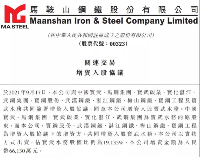 9月17日,馬鞍山鋼鐵股份(00323.HK)發布公告,將與中國寶武、馬鋼集團、寶武碳業、寶化湛江、武鋼集團,寶鋼股份、武漢鋼鐵、湛江鋼鐵、梅山鋼鐵、寶鋼工程及寶武水務共同簽署增資入股協議,同意公司增資入股寶武水務。馬鞍山鋼鐵公司以實物方式出資,占寶武水務股權比例為19.135%,公司增資金額為人民幣66,130萬元。