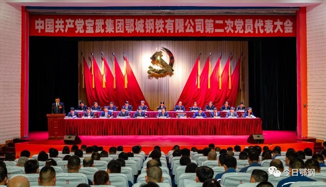 10月15日上午9點,鄂鋼職工文化活動中心內氣氛熱烈,主席台正中懸掛著中國共產黨黨徽,10麵鮮豔奪目的紅旗分列兩側。在莊嚴的國歌聲中,鄂城鋼鐵第二次黨員代表大會隆重開幕。大會的主題是:高舉習近平新時代中國特色社會主義思想偉大旗幟,深入貫徹黨的十九大、十九屆曆次全會和習總書記“七一”重要講話精神,以習總書記考察調研中國寶武重要講話精神為引領,政治統領把方向,凝心聚力促發展,努力打造“百億級營收、十億級利潤、營運千萬噸級”的優秀鋼鐵企業,極致效率的綠色智慧型城市鋼廠,讓“用戶滿意、股東放心、社會推崇、員工幸福”的美麗鄂鋼,在新的曆史起點上,不斷把鄂鋼的各項事業推向前進!