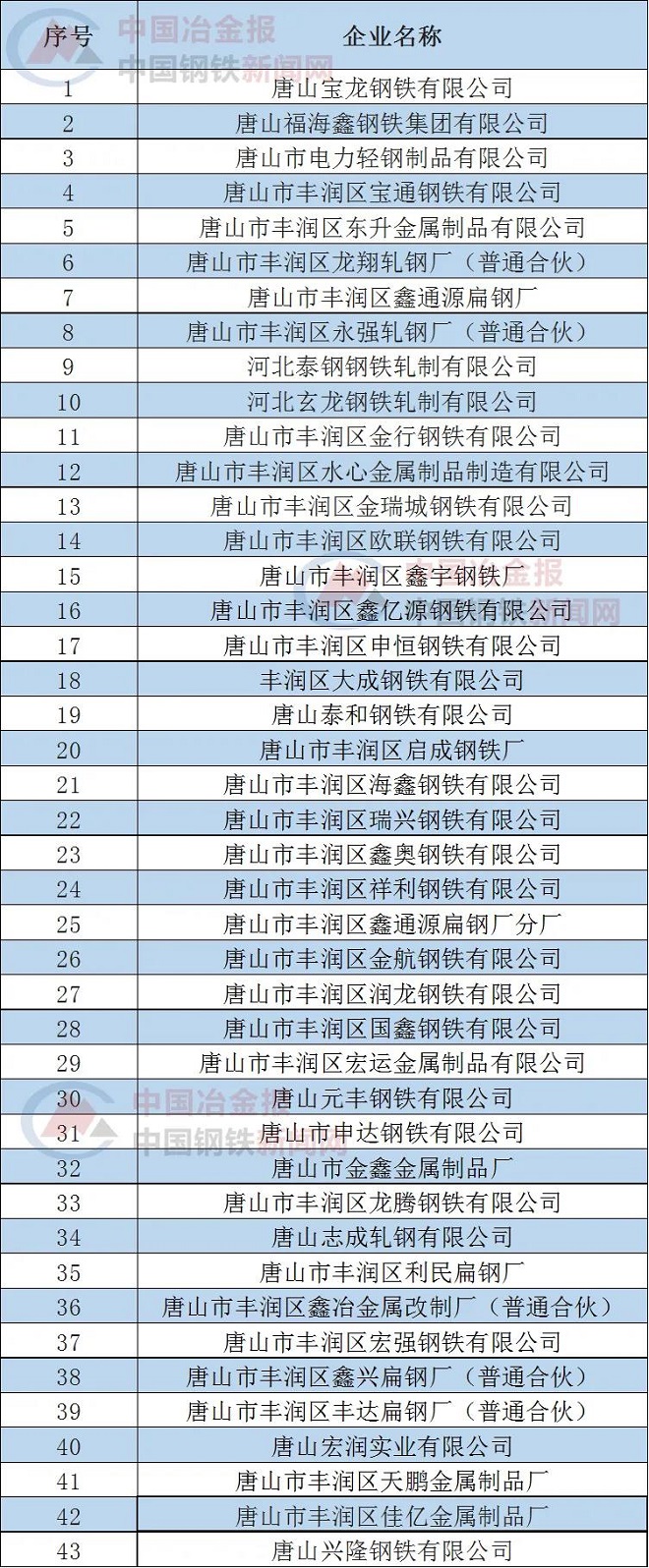 按照《唐山市獨立軋鋼行業整治提升工作方案》,唐山市生態環境局組織鋼鐵行業專家對唐山市部分獨立軋鋼企業進行了現場驗收,並從2021年8月18日開始分批予以公示。截止目前,共有43家獨立軋鋼企業通過驗收。具體名單如下: