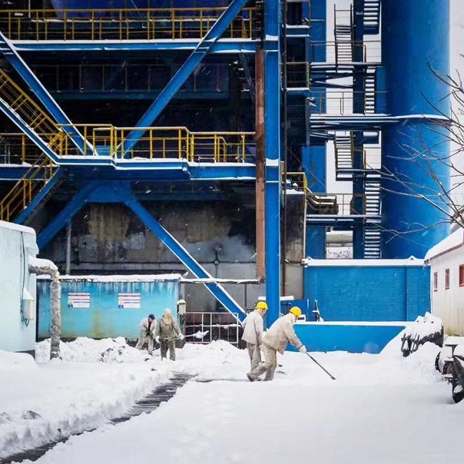鞍山鋼鐵耐火材料公司夜班職工交班後,與白班同誌一同清理廠區積雪,排查安全隱患,做好鞍山鋼鐵冶金石灰熔劑保產保供工作。