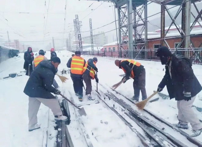 鞍鋼股份線材廠20多名幹部職工參與清掃靈山站鐵路沿線積雪,在兩小時內清理出道岔近十個。