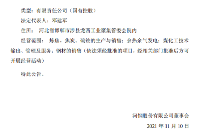 11月10日,河鋼股份發布了《關於鋼鐵、焦化項目公司完成工商注冊的公告》。