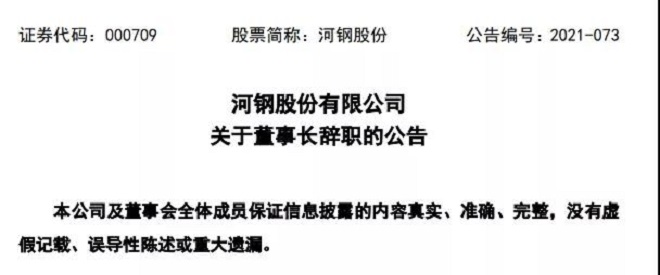 11月11日晚,河鋼股份發布了關於董事長辭職的公告。