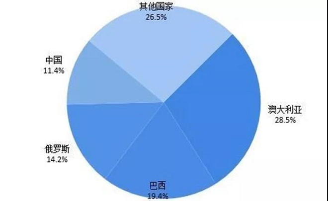 圖:2020年全球鐵礦石儲量地區分布(單位:%)(來源:USGS)