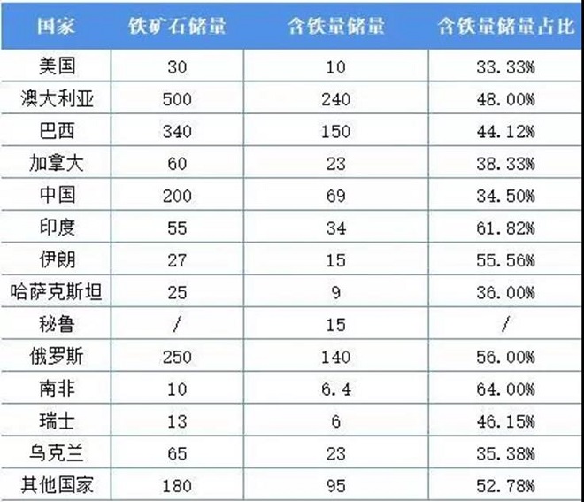 表:2020年全球鐵礦石儲量區域分布(單位:億噸,%)(來源:USGS)