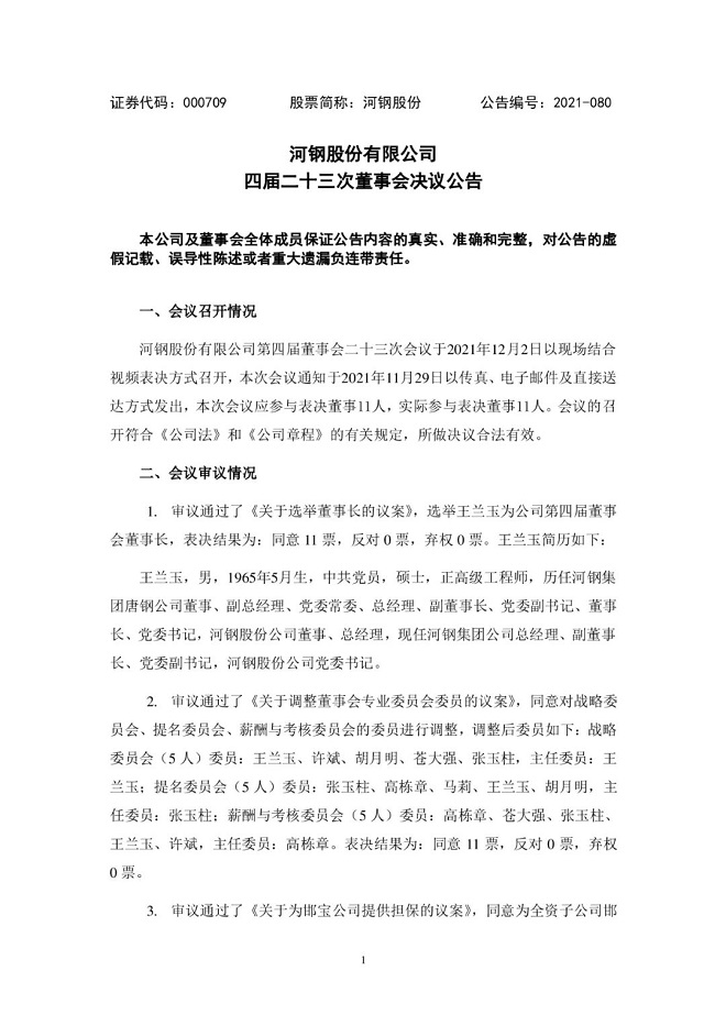 《公告》稱,河鋼股份有限公司第四屆董事會二十三次會議於2021年12月2日以現場結合視頻表決方式召開,在會上審議通過了《關於選舉董事長的議案》,選舉王蘭玉為公司第四屆董事會董事長,表決結果為:同意11票,反對0票,棄權0票。此前,河鋼股份曾發布公告稱,11月10日接到董事長劉鍵的辭職申請,劉鍵因工作調動,提出辭去該公司第四屆董事會董事長及董事會下設專業委員會的相應職務(詳情參看:《河鋼股份:劉鍵辭任董事長 許斌暫履職》)。