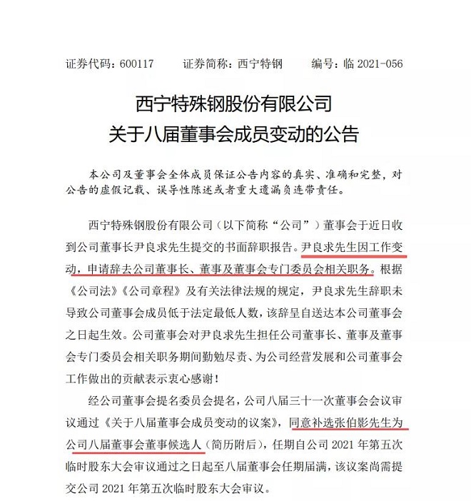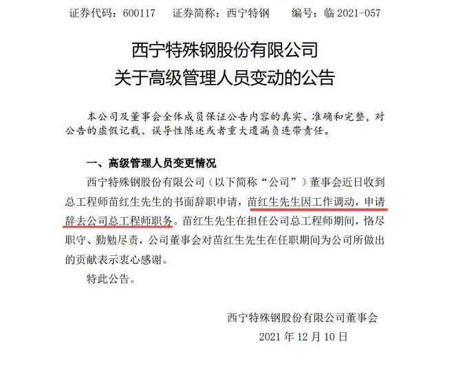 12月11日,西寧特鋼(600117)發布公告,公布了西寧特殊鋼股份有限公司的人事變動情況。該公司董事長尹良求因工作變動,申請辭去公司董事長、董事及董事會專門委員會相關職務,該公司補選張伯影為八屆董事會董事候選人。該公司總工程師苗紅生因工作調動,申請辭去公司總工程師職務。