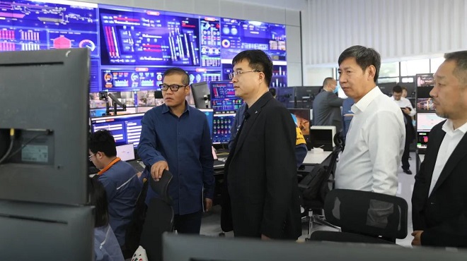 丁立國一行參觀了湛江鋼鐵指中12樓展廳、管控中心、高爐平台、物流中心、水控中心等。