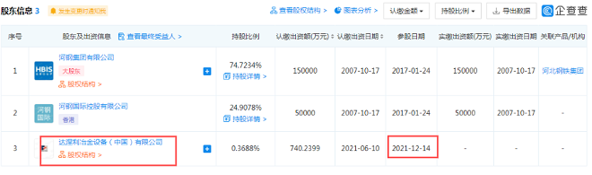 2021年12月14日,據企查查消息顯示,石家莊鋼鐵有限責任公司新增股東達涅利冶金設備(中國)有限公司,任資出繳額740.2399萬元,占股比例達0.3688%。隨之,該公司注冊資本也由“200000萬人民幣”增加到“200740.2399萬元人民幣”。股權結構由原來河鋼集團、河鋼國際控股有限公司兩家內資企業絕對控股,轉為三家企業、內外資聯合持股,成為河鋼國際化發展的又一個注腳。