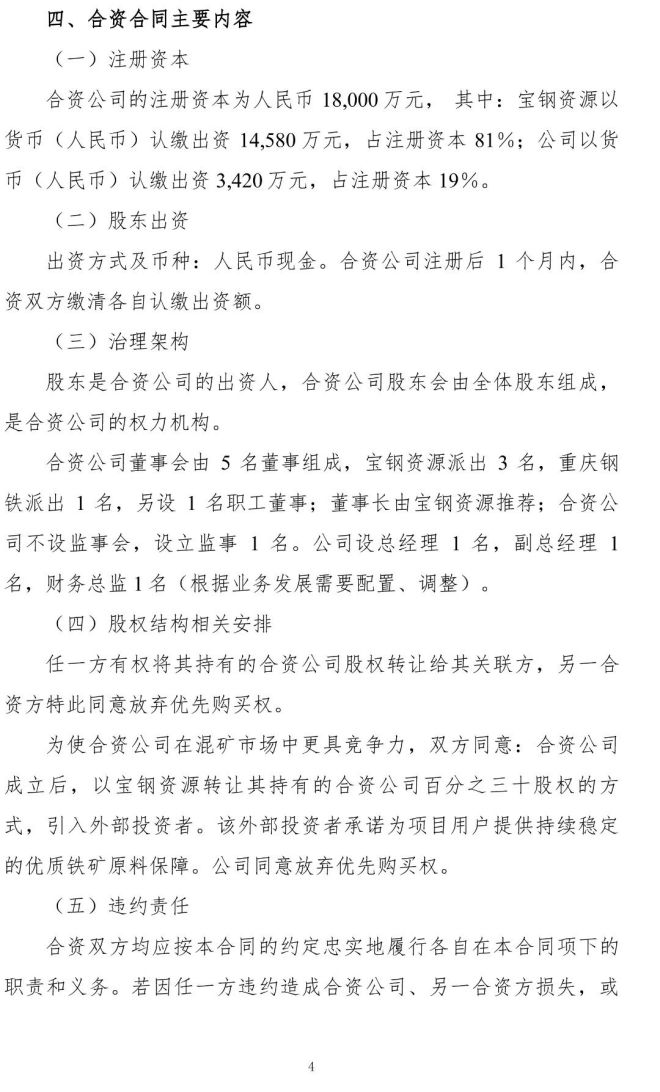 《公告》稱,重慶鋼鐵股份有限公司(簡稱“公司”)擬與寶鋼資源共同出資組建“寶武精成(舟山)礦業科技有限公司”(簡稱“合資公司”),注冊資本擬定為人民幣 18,000 萬元。股東雙方均以貨幣方式出資,其中:公司持股比例 19%,出資人民幣 3,420 萬元;寶鋼資源持股比例 81%,出資人民幣 14,580 萬元。合資公司成立後,將在馬跡山開展鐵礦石混勻加工業務。