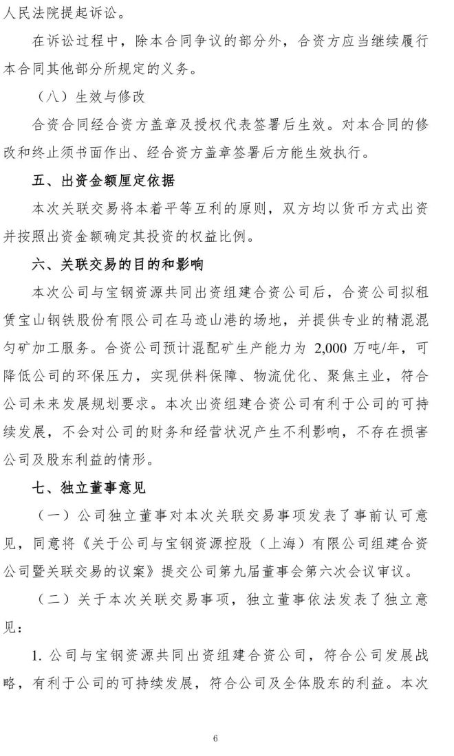 2021 年 12 月 21 日,公司第九屆董事會第六次會議表決通過《關於公司與寶鋼資源控股(上海)有限公司組建合資公司暨關聯交易的議案》,公司董事會審議通過以及寶鋼資源履行完內部審批程序後,雙方正式簽訂合資合同。
