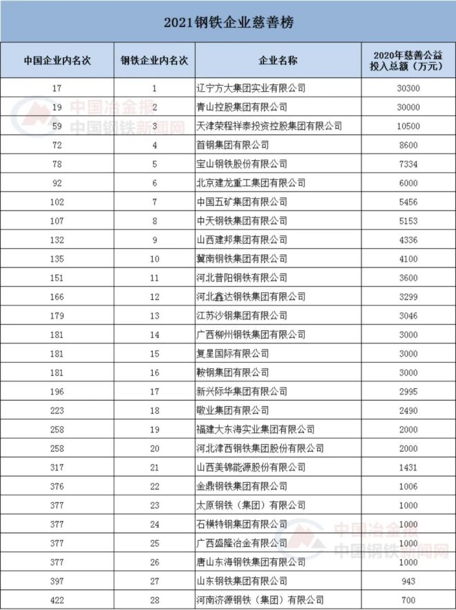 2021中國企業慈善公益500強名單現已在中國企業慈善公益論壇網站發布。《中國冶金報》、中國鋼鐵新聞網小編對上榜的鋼鐵企業進行了彙總整理,製作了《2021鋼鐵企業慈善榜》。其中,遼寧方大集團以3.03億元在鋼鐵企業中位列榜首;青山控股以3億元位列第二;天津榮程以1.05億元位列第三。