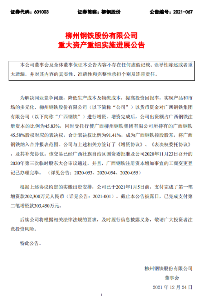 12月24日,柳州鋼鐵股份有限公司發布了《柳州鋼鐵股份有限公司 重大資產重組實施進展公告》(以下簡稱《公告》)。