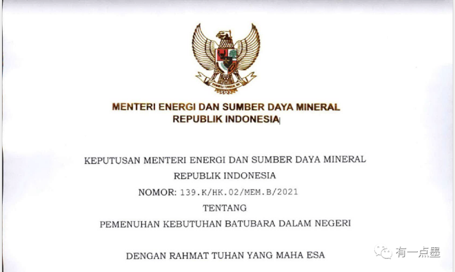 2021年12月31日,印尼能礦部在一封信件中表示,為緩解當前煤炭供應緊缺問題,優先國內電力需求,自2022年1月1日至1月31日,印尼禁止煤炭出口,包括正在裝的以及未裝完的煤船,都應供給國家電廠。