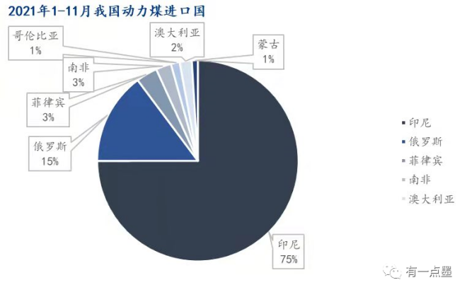 印尼不僅是全球最大的動力煤出口國,也是中國動力煤的主要進口國。2021年1-11月我國動力煤進口國分布:印尼75%、俄羅斯15%、菲律賓3%、南非3%、澳大利亞2%、哥倫比亞1%、蒙古1%。