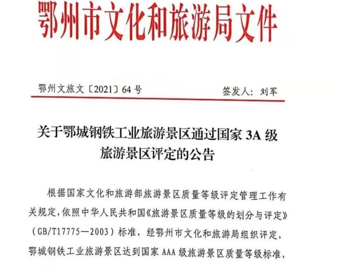 按照《旅遊景區質量等級的劃分與評定》國家標準和《旅遊景區質量等級管理辦法》,鄂城鋼鐵積極推進工業旅遊3A級景區達標創評工作,並於2021年12月23日被正式確定為國家3A級旅遊景區。