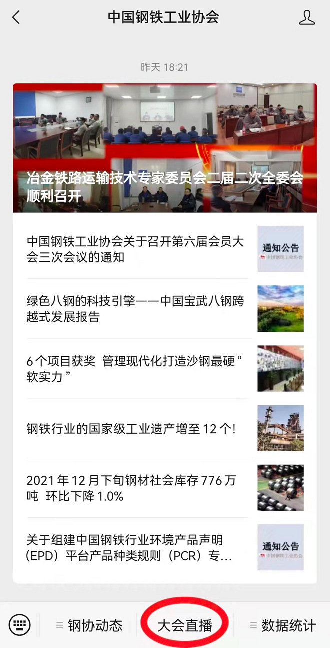 1月10日上午9:00,中zhong國guo鋼gang鐵tie工gong業ye協xie會hui第di六liu屆jie會hui員yuan大da會hui三san次ci會hui議yi即ji將jiang召zhao開kai。本ben次ci會hui議yi將jiang通tong過guo視shi頻pin的de形xing式shi召zhao開kai,北bei京jing設she主zhu會hui場chang。屆jie時shi,我wo們men將jiang通tong過guo鋼gang協xie微wei信xin公gong眾zhong號hao和he官guan方fang網wang站zhan