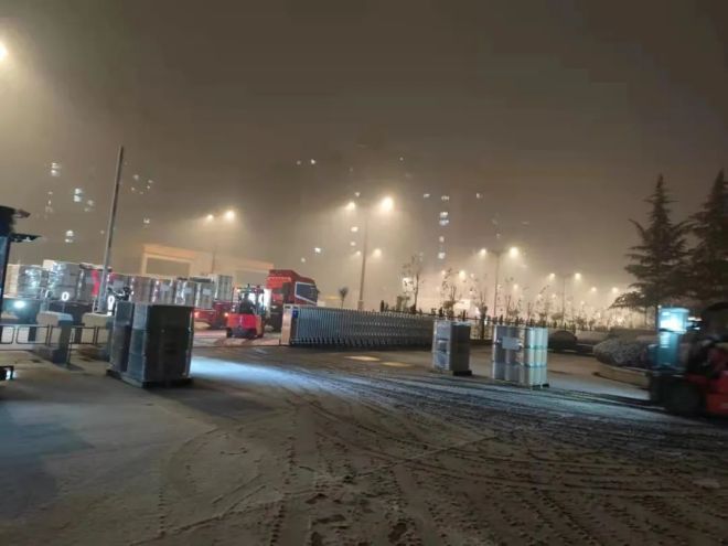 1月5日一早,廠區被夜間持續的大雪覆蓋,嚴重影響了工人和車輛的通行。複合事業部、功gong能neng與yu不bu定ding形xing事shi業ye部bu黨dang員yuan骨gu幹gan一yi方fang麵mian積ji極ji調tiao配pei人ren手shou全quan副fu武wu裝zhuang,及ji時shi清qing理li地di麵mian積ji雪xue,一yi方fang麵mian加jia緊jin排pai產chan,做zuo好hao外wai銷xiao產chan品pin和he關guan鍵jian領ling域yu產chan品pin等deng核he心xin訂ding單dan的de生sheng產chan安an排pai,確que保bao抗kang疫yi情qing保bao生sheng產chan兩liang不bu誤wu。5日晚,接到院裏前往防疫交接區領取防疫和生活物資的指示後,窯具事業部負責人親自部署,緊急安排黨員骨幹聯係叉車、板車到防控交接區領取物資。其他同誌顧不上剛剛結束生產任務的勞累,做好消毒、防護後迅速趕往交接區,一大包一大包、yigelaihuiyouyigelaihuidijiangwuzibanyundaochangqu。jishizailayuededongrili,tamenyiranmangdehanliujiabei,hanshuishunzhelianjialiuxiayegubushangcaqu,xiongqiandedanghuizailudengdeyingzhaoxiafachuyaoyandeguangmang。