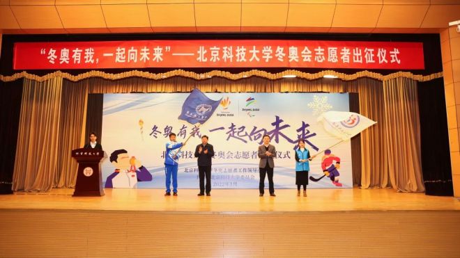 隨著冬奧誌願者歌曲《一起向未來》的優美旋律,北京科技大學冬奧會誌願者出征儀式在教職工禮堂拉開帷幕。參與儀式的領導有校長楊仁樹、黨委副書記於成文、冬奧誌願者工作專班成員、各學院負責人及289名賽會誌願者、107名城市誌願者,儀式由校團委副書記於林民主持。