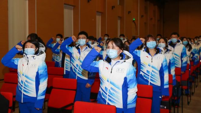 儀式的末尾,全體誌願者在主持人的帶領下莊嚴宣誓。在擲地有聲、高亢激昂的承諾中,儀式圓滿落幕。而屬於誌願者們的征程才剛剛開始,期待他們在冬奧會的卓越風姿,也期盼他們凱旋歸來!