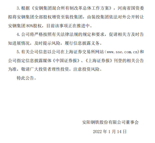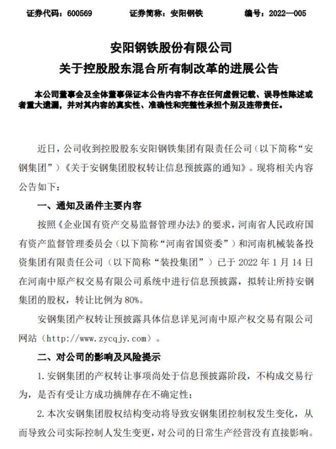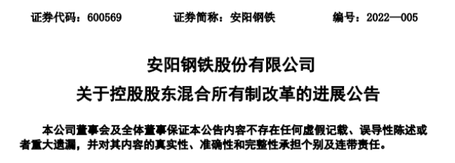 2022年1月14日,安陽鋼鐵股份有限公司發布了《關於控股股東混合所有製改革的進展公告》(以下簡稱“《公告》”)。