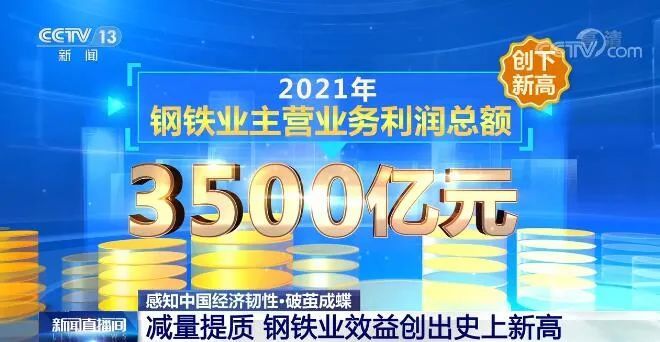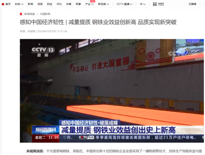 1月18日,央視網以《感知中國經濟韌性| 減量提質 鋼鐵業效益創新高 品質實現新突破》為題,報道了中國鋼鐵業的發展情況。
