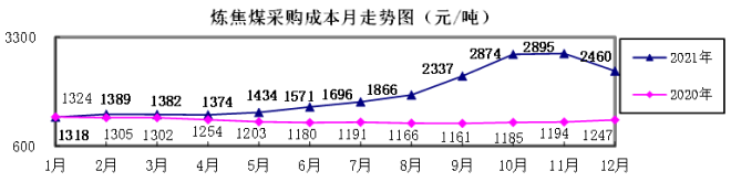 對標企業煉焦煤12月份加權平均折算成幹基的采購成本為2460.43元/噸,環比下降434.63元/噸,降幅為15.01%。1-12月累計平均折算成幹基的采購成本為1900.76元/噸,同比升高667.97元/噸,升幅為54.18%。