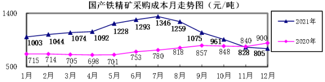 國產鐵精礦(幹基)12月份加權平均采購成本為804.83元/噸,環比下降23.42元/噸,降幅為2.83%。1-12月累計平均采購成本為1112.87元/噸,同比升高328.00元/噸,升幅為41.79%。
