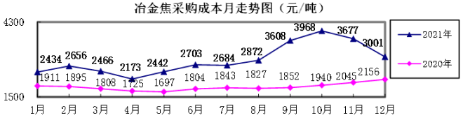 冶金焦12月份加權平均折算成幹基的采購成本3000.79元/噸,環比下降666.39元/噸,降幅為18.17%。1-12月累計平均折算成幹基的采購成本為2861.97元/噸,同比升高979.14元/噸,升幅為52.00%。