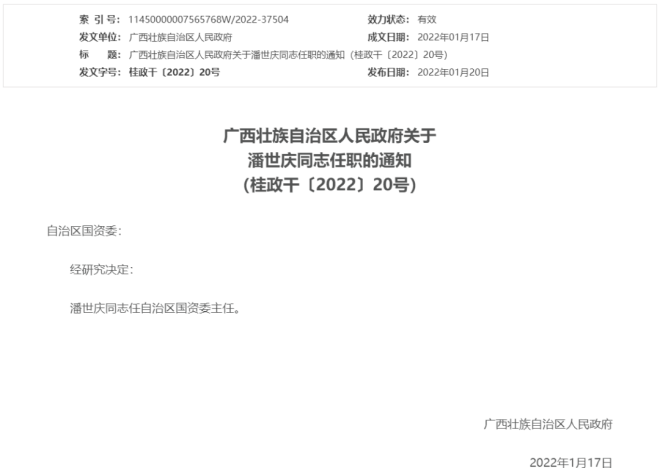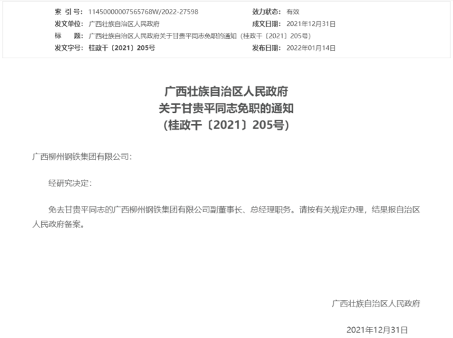 近日,廣西壯族自治區人民政府網站發布了有關柳鋼集團的人事信息:潘世慶同誌任自治區國資委主任;免去甘貴平同誌的廣西柳州鋼鐵集團有限公司副董事長、總經理職務,任自治區直屬企業專職外部董事。