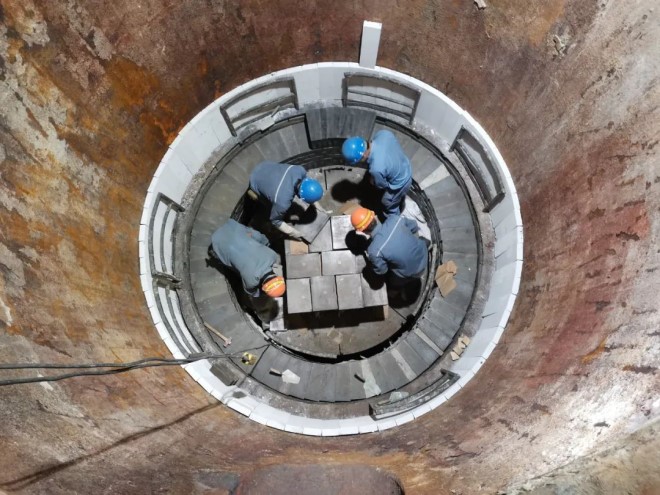 轉爐是煉鋼關鍵設備,以鐵水、廢鋼、鐵合金為主要原料,不借助外加能源,靠鐵液本身的物理熱和鐵液組分間化學反應產生熱量而在轉爐中完成煉鋼過程,寶鋼、梅鋼、湛鋼轉爐承鋼量設有150噸、250噸、300噸、350噸多種規格。大型轉爐耐材砌築施工工期時間長,磚型複雜,單次爐修耐材砌築量高達820噸,施工任務艱巨,安全質量管控難度係數極大。此次砌築“鐵軍”挑戰的是寶鋼二煉鋼250噸的六號轉爐,適逢新春的到來,砌築“鐵軍”們都選擇留下來,迎戰轉爐砌築任務。轉爐所用的耐火磚單重約45公斤,最大的單重可達55公斤,平均每個人在12小時內大約需砌築5噸的耐火磚,“鐵軍”們再一次用鋼鐵般的意誌保質保量完成轉爐出鋼口組合安裝、爐底風口芯磚安裝、爐底砌築、爐身砌築、爐帽砌築、爐口澆注等施工任務,保質保量完成爐修砌築任務,為春節期間的煉鋼生產任務打下堅實基礎。