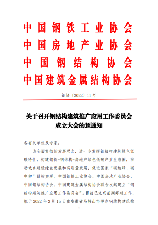 關於召開鋼結構建築推廣應用工作委員會成立大會的預通知