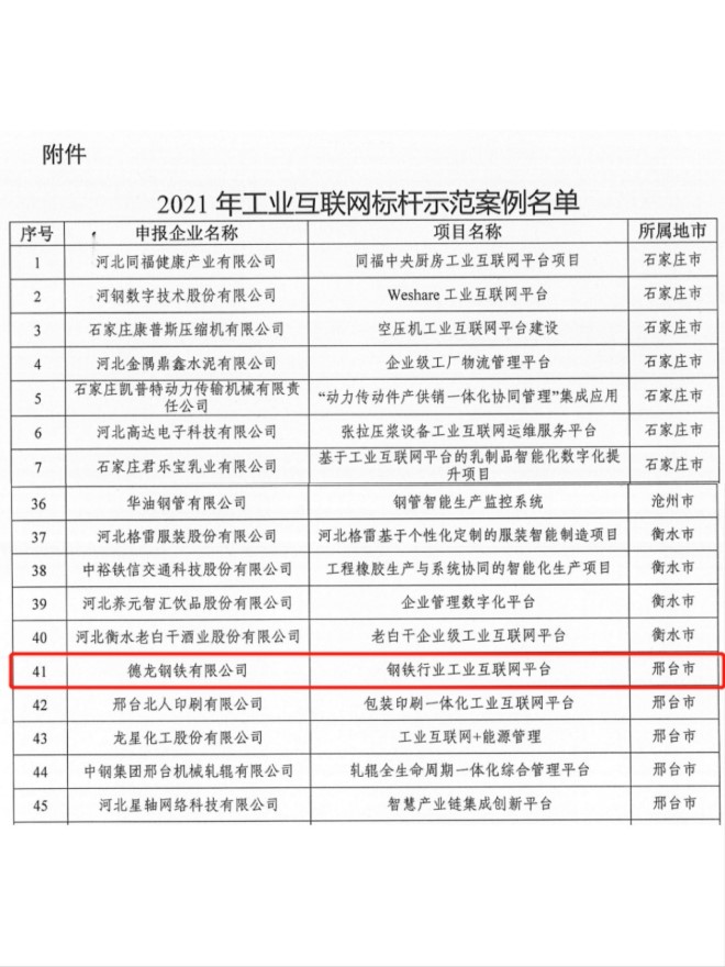 近日,河北省工業和信息化廳發布了《2021年工業互聯網標杆示範案例名單》,德龍鋼鐵有限公司建設的鋼鐵工業大數據平台成功入選並成為示範案例。