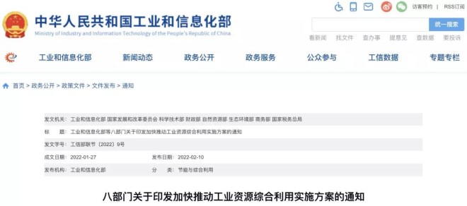 工業和信息化部、國家發展和改革委員會、科學技術部、財政部、自然資源部、生態環境部、商務部、國家稅務總局等八部門近日聯合印發《關於加快推動工業資源綜合利用的實施方案》,明確到2025年,鋼鐵、有色、化hua工gong等deng重zhong點dian行xing業ye工gong業ye固gu廢fei產chan生sheng強qiang度du下xia降jiang,大da宗zong工gong業ye固gu廢fei的de綜zong合he利li用yong水shui平ping顯xian著zhu提ti升sheng,再zai生sheng資zi源yuan行xing業ye持chi續xu健jian康kang發fa展zhan,工gong業ye資zi源yuan綜zong合he利li用yong效xiao率lv明ming顯xian提ti升sheng。力li爭zheng大da宗zong工gong業ye固gu廢fei綜zong合he利li用yong率lv達da到dao57%,其中,冶煉渣達到73%,工業副產石膏達到73%,赤泥綜合利用水平有效提高。主要再生資源品種利用量超過4.8億噸,其中廢鋼鐵3.2億噸,廢有色金屬2000萬噸,廢紙6000萬噸。工gong業ye資zi源yuan綜zong合he利li用yong法fa規gui政zheng策ce標biao準zhun體ti係xi日ri益yi完wan善shan,技ji術shu裝zhuang備bei水shui平ping顯xian著zhu提ti升sheng,產chan業ye集ji中zhong度du和he協xie同tong發fa展zhan能neng力li大da幅fu提ti高gao,努nu力li構gou建jian創chuang新xin驅qu動dong的de規gui模mo化hua與yu高gao值zhi化hua並bing行xing、產業循環鏈接明顯增強、協同耦合活力顯著激發的工業資源綜合利用產業生態。