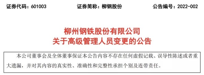 2月10日,柳州鋼鐵股份有限公司發布了《關於高級管理人員變更的公告》(以下簡稱“《公告》”)。從《公告》zhonghuoxi,jinri,liuganggufendongshihuishoudaodongshijianfuzongjinglitanshaodongdeshumiancicheng,qiyingongzuobiandongyuanyin,ciquliuganggufenfuzongjinglizhiwu,danrengjixudanrenliuganggufendongshizhiwu。