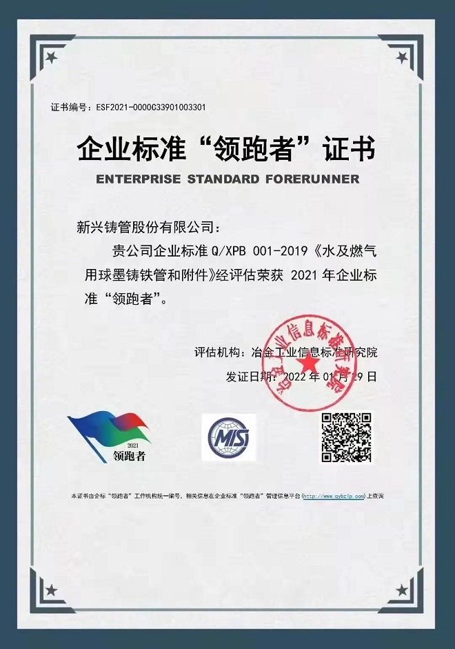日前,經新興鑄管股份有限公司標準團隊申報、冶金工業信息標準研究院權威評審,新興鑄管企業標準Q/XPB 001-2019《水及燃氣用球墨鑄鐵管和附件》榮獲2021年企業標準“領跑者”稱號,這是該標準繼獲評2019年企業標準“領跑者”之後再度保持的一項重要榮譽。