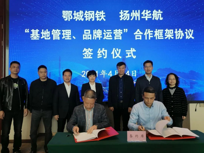 2021年4月14日,揚州華航特鋼有限公司與寶武集團鄂城鋼鐵有限公司簽訂“基地管理+品牌運營”合作框架協議,共建共享高質量鋼鐵生態圈。