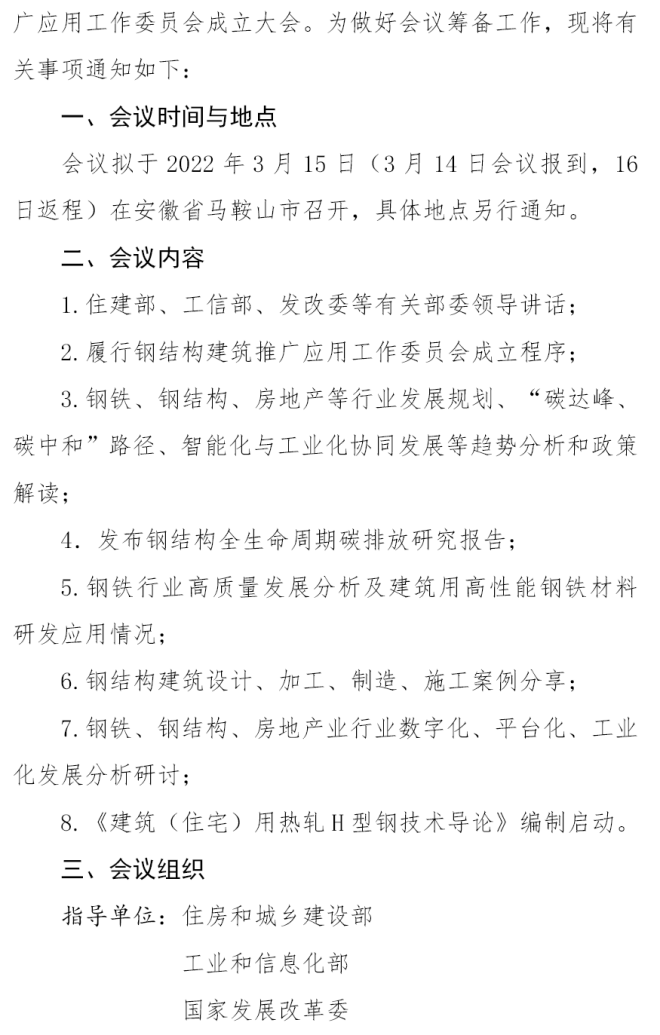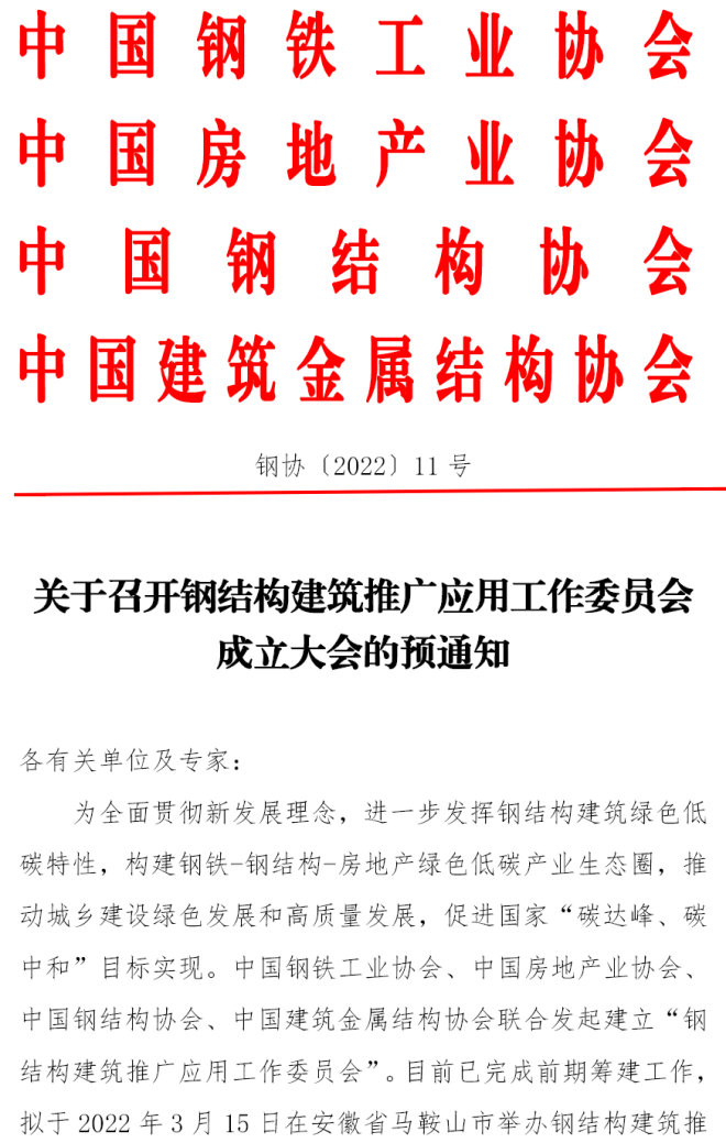 關於召開鋼結構建築推廣應用工作委員會成立大會的預通知