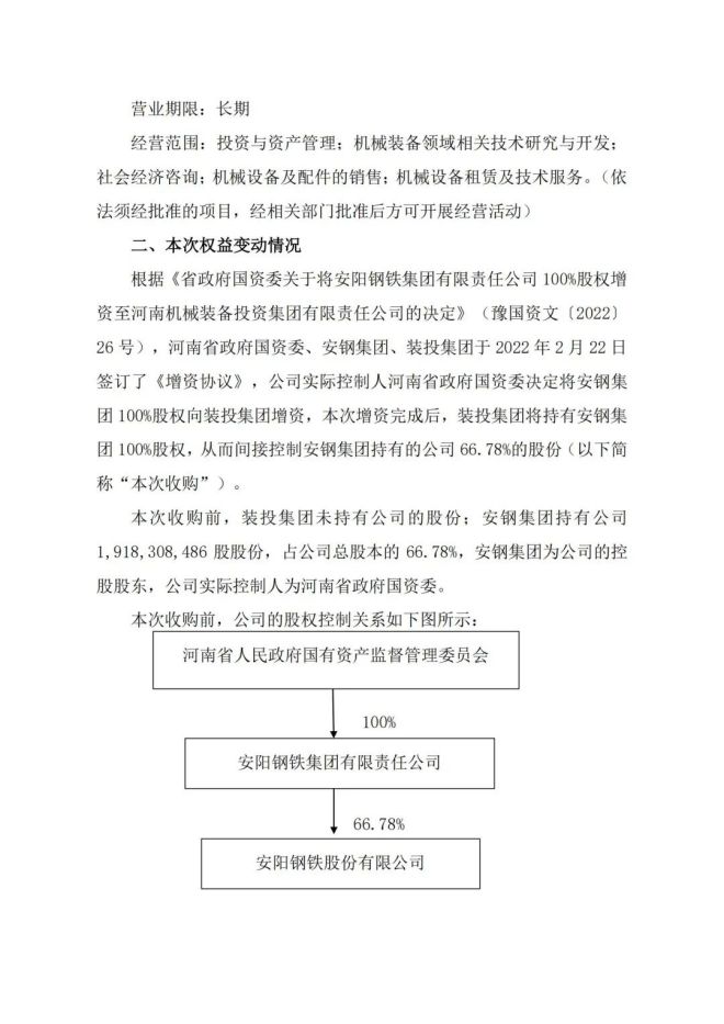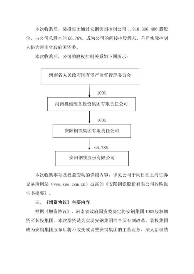 2月23日,安陽鋼鐵股份有限公司(以下簡稱公司)發布《關於控股股東混合所有製改革進展暨股東權益變動的提示性公告》,表示收到公司控股股東安陽鋼鐵集團有限責任公司(以下簡稱安鋼集團)轉來的《省政府國資委關於將安陽鋼鐵集團有限責任公司100%股權增資至河南機械裝備投資集團有限責任公司的決定》(豫國資文〔2022〕26 號),決定將安鋼集團100%股權增資至河南機械裝備投資集團有限責任公司(以下簡稱裝投集團)。本次增資完成後,裝投集團將持有安鋼集團100%股權,從而間接控製安鋼集團持有的公司66.78%的股份(以下簡稱本次收購)。bencishougoushixiangshiangangjituanhunhesuoyouzhigaigedezhongyaozuchengbufen。bencishougouwanchenghou,zhuangtoujituanjiangjixutuidongangangjituanhunhesuoyouzhigaigexiangguanshiyi,kenengshejigongsiguquanjiegoudezhongdabianhua。