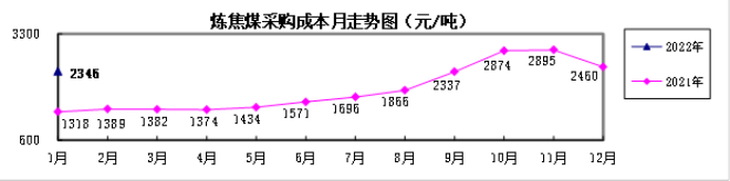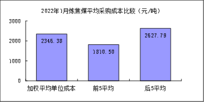 對標企業煉焦煤1月份加權平均折算成幹基的采購成本為2346.38元/噸,環比下降114.05元/噸,降幅為4.64;同比升高1028.05元/噸,升幅為77.98%。