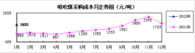 噴吹煤1月份加權平均折算成幹基的采購成本為1654.97元/噸,環比下降88.44元/噸,降幅為5.07%;同比升高666.55元/噸,升幅為67.44%。