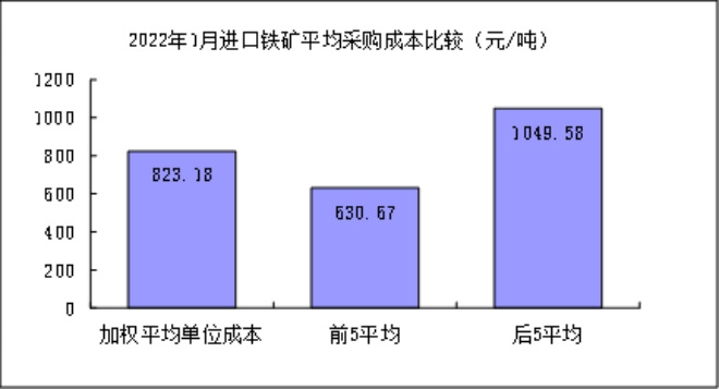1月對標企業進口粉礦折算成62%品位的平均采購成本為792.69元/噸,成本最低的前5家企業的加權平均采購成本為643.59元/噸,比對標企業平均采購成本低149.10元/噸,低於平均采購成本18.81%;而采購成本最高的5家企業加權平均采購成本為987.42元/噸,比對標企業平均采購成本高194.73元/噸,高於平均采購成本24.57%。