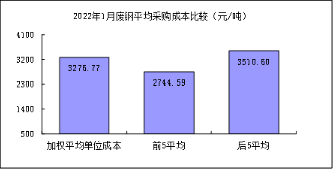 廢鋼1月份加權平均采購成本為3276.77元/噸,環比升高156.47元/噸,升幅為5.01%;同比升高432.39元/噸,升幅為15.20%。