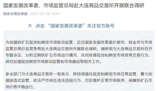2月28日,國家發展改革委官微發布消息稱,為加強鐵礦石現貨和期貨市場聯動監管,近日國家發展改革委價格司、財金司與市場監管總局價監競爭局赴大連商品交易所開展聯合調研。調研組與大連商品交易所召開專題會議,分析近期鐵礦石市場運行情況,共同排查現貨和期貨市場異常交易行為,研究加強現貨期貨市場聯動監管和市場建設等相關工作。