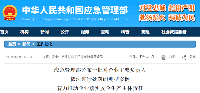 2月28日,中華人民共和國應急管理部網站發布了《應急管理部公布一批對企業主要負責人依法進行處罰的典型案例 著力推動企業落實安全生產主體責任》(以下簡稱:“《案例》”)。《案例》公(gong)布(bu)了(le)一(yi)批(pi)對(dui)企(qi)業(ye)主(zhu)要(yao)負(fu)責(ze)人(ren)依(yi)法(fa)進(jin)行(xing)處(chu)罰(fa)的(de)典(dian)型(xing)案(an)例(li),推(tui)動(dong)企(qi)業(ye)主(zhu)要(yao)負(fu)責(ze)人(ren)依(yi)法(fa)履(lv)職(zhi)盡(jin)責(ze),全(quan)麵(mian)落(luo)實(shi)安(an)全(quan)生(sheng)產(chan)主(zhu)體(ti)責(ze)任(ren),不(bu)斷(duan)提(ti)升(sheng)企(qi)業(ye)本(ben)質(zhi)安(an)全(quan)水(shui)平(ping)。